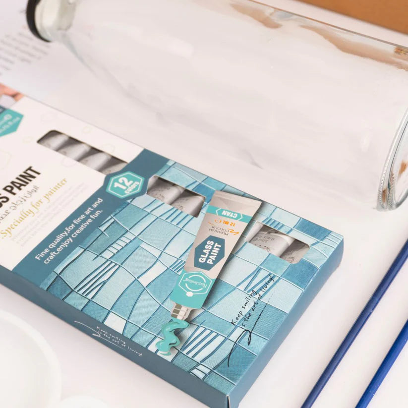 Complete Creative Kit: Includes 1 litre glass bottle ready to paint and decorate glass paints in 12 vibrant 12 ml bottles palette for colour mixing 2 paint brushes fine tip and flat tip gold liner for elegant details LED light to make your bottle glow beautifully UHU glue and step-by-step instructions for easy fun and beautiful results